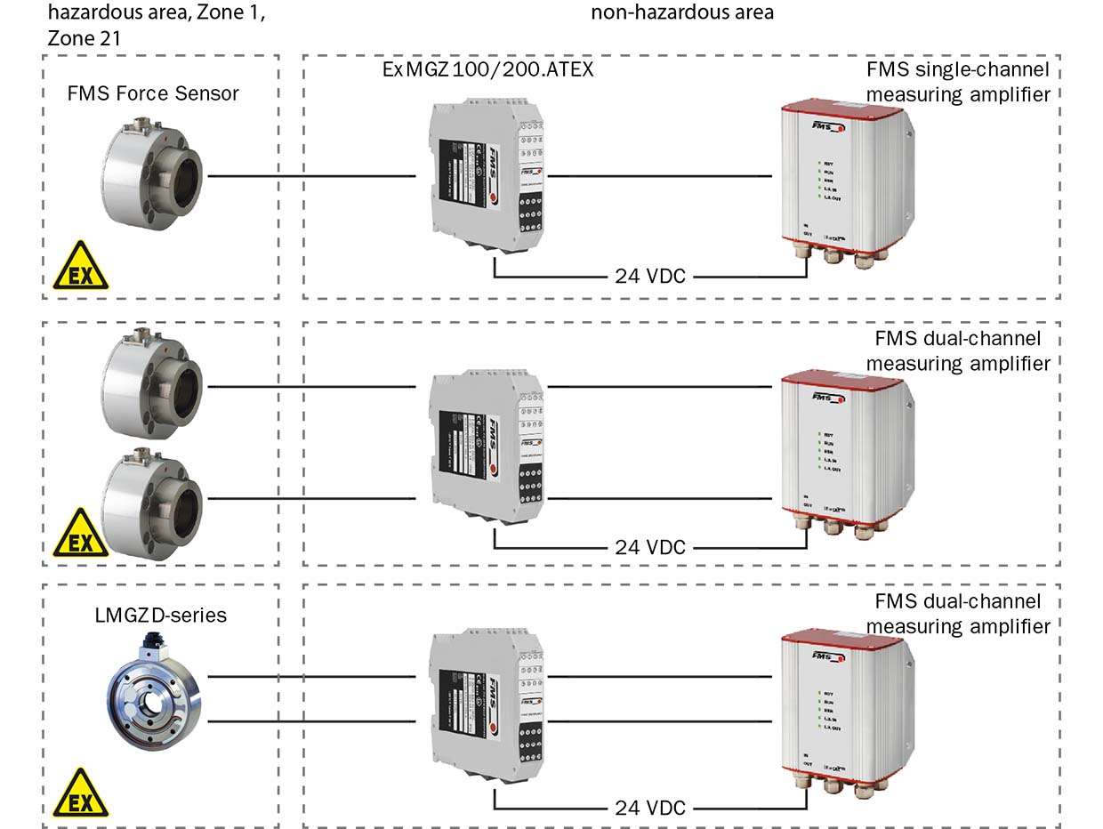 活軸 (LMGZ) 與死軸 (RMGZ) 傳感器皆可搭配 ExMGZ 隔離柵使用,提供高精度張力測量。